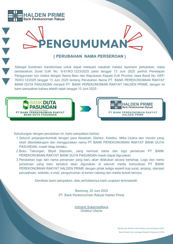 Perubahan nama Bank BPR Duta Pasundan menjadi BPR Halden Prime
